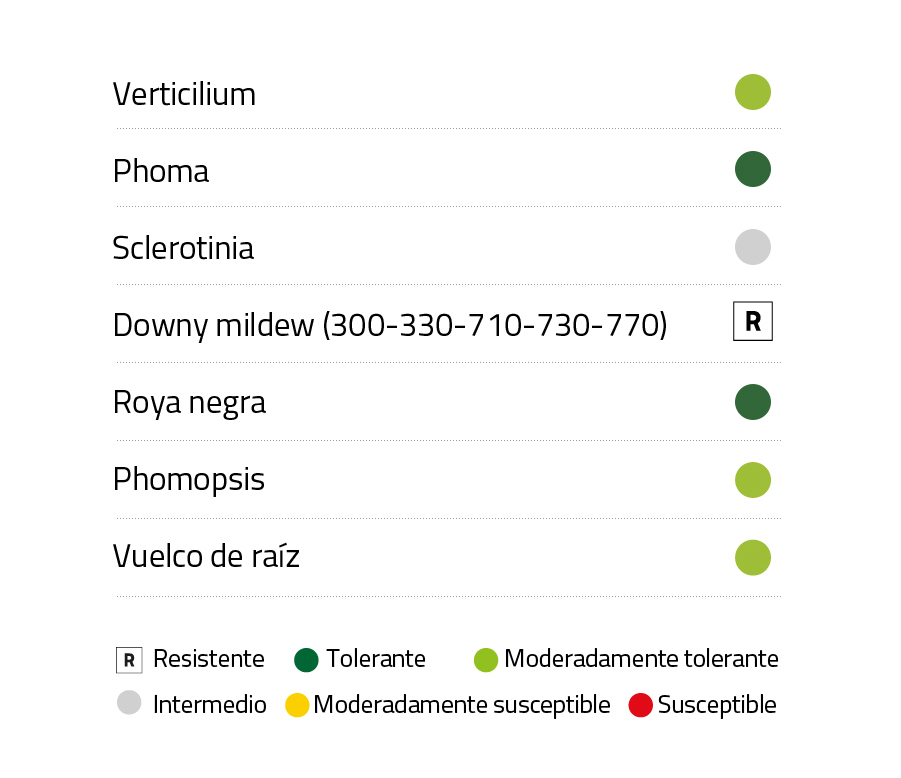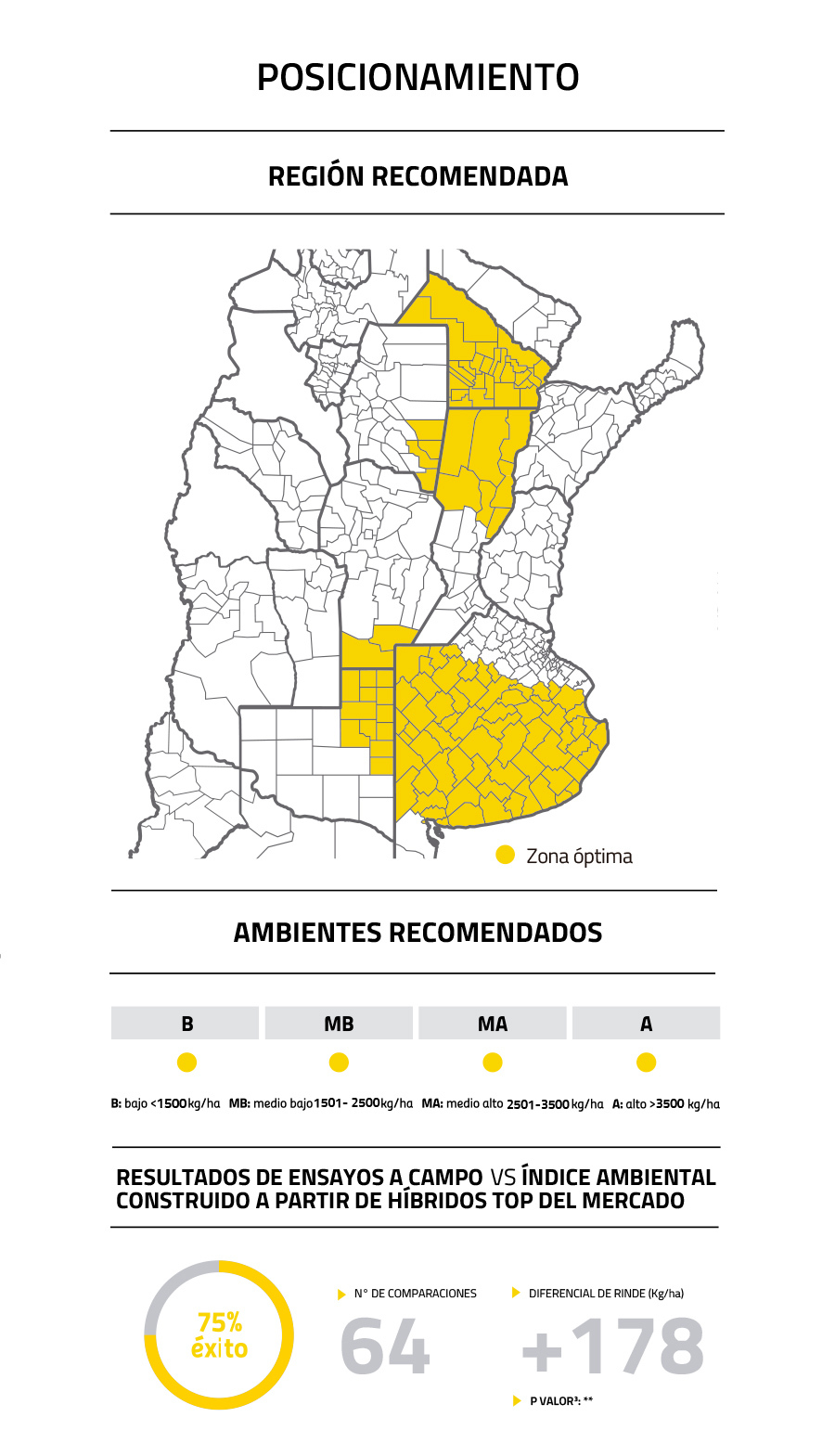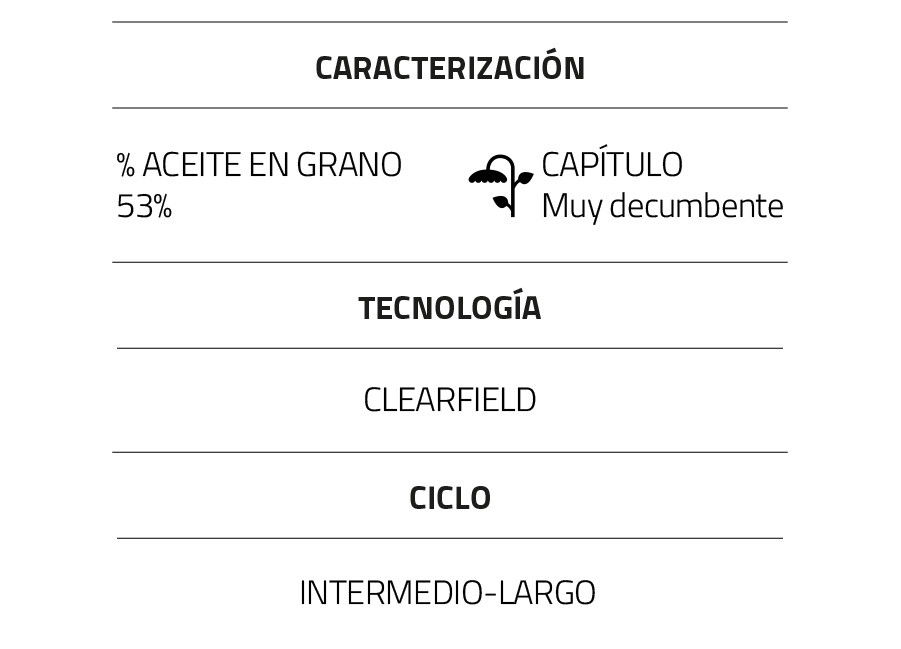 Híbrido de alto potencial y ciclo intermedio – largo. Con alto contenido de aceite y destacado perfil sanitario. Adaptable a todas las regiones girasoleras.