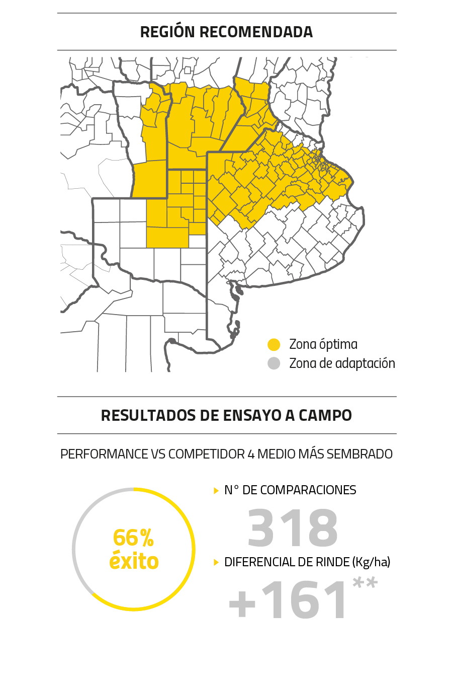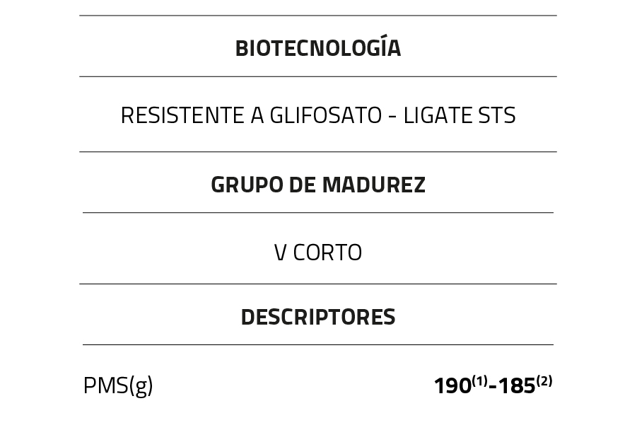 Grupo V Corto con el mayor rendimiento del mercado con biotecnología, resistente a Glifosato y Ligate STS.